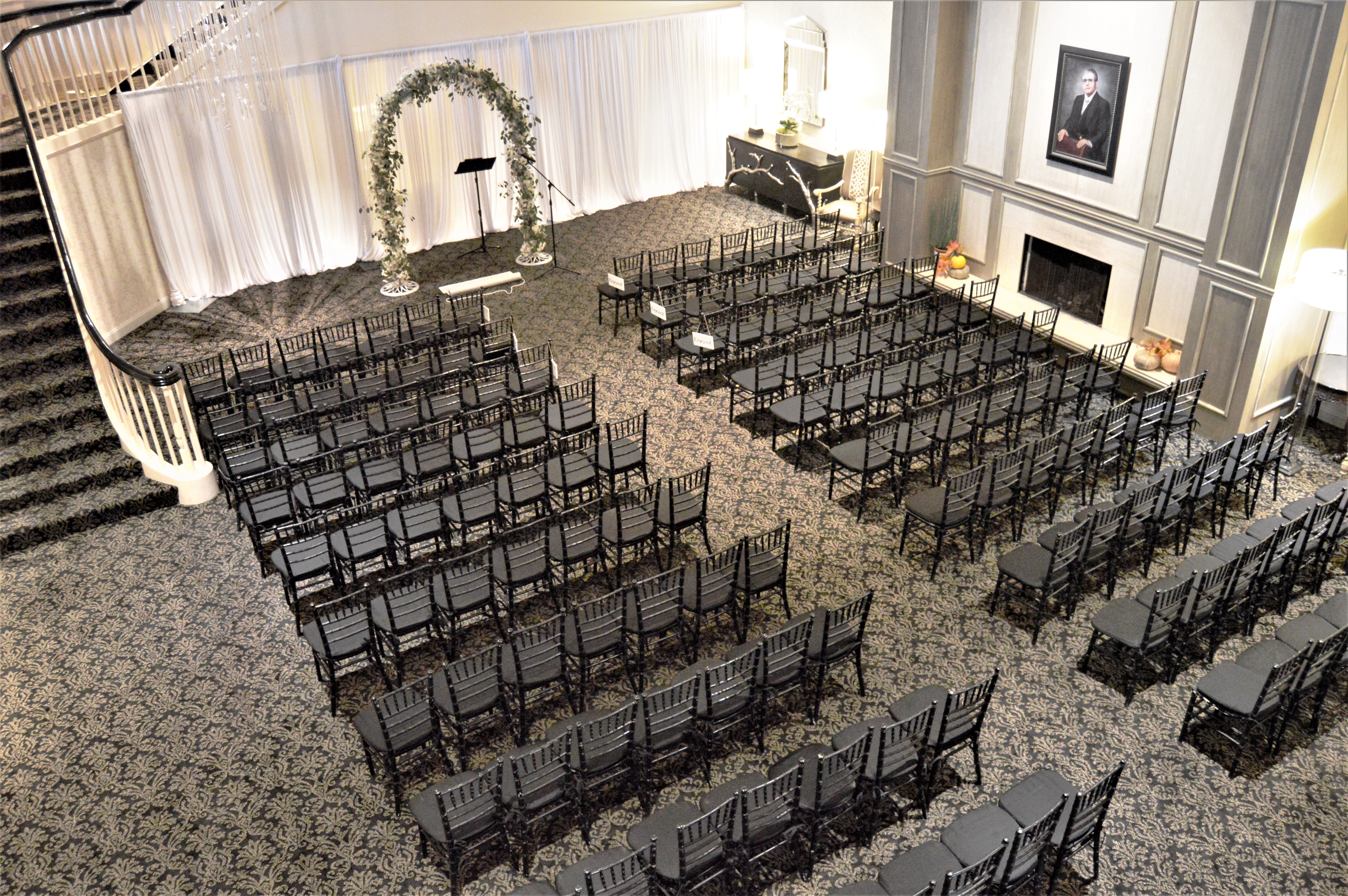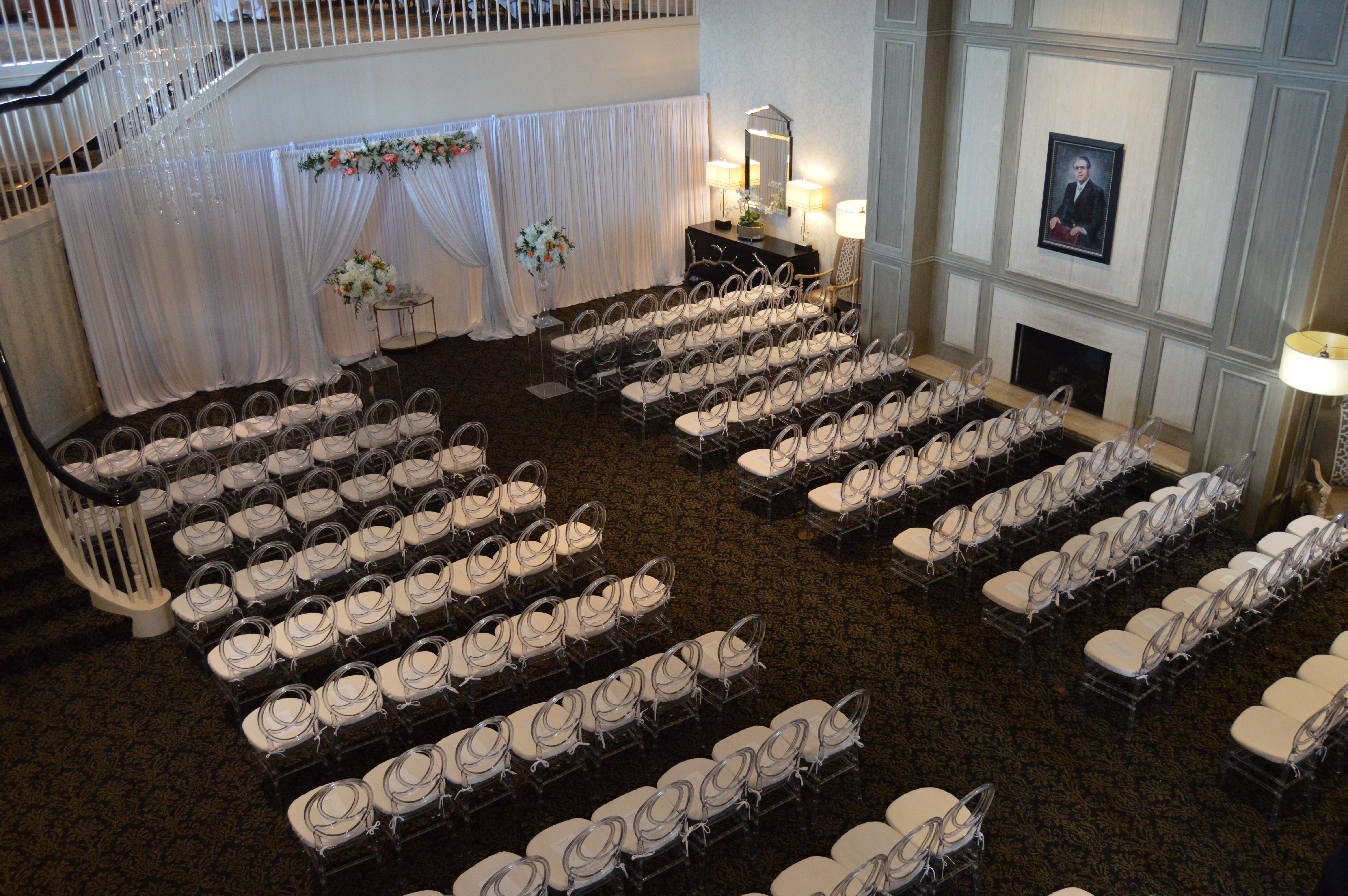 Beautiful room overlooking the lobby with an outdoor terrace. Capacity up to 120